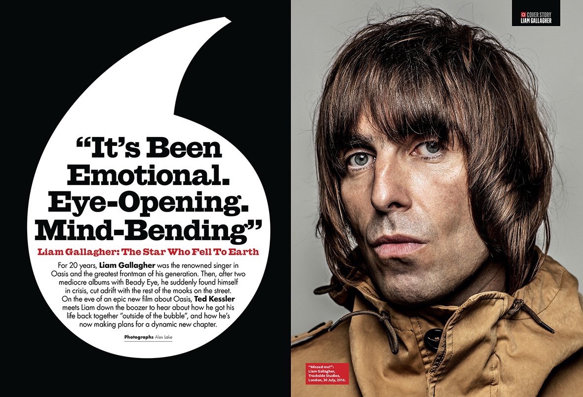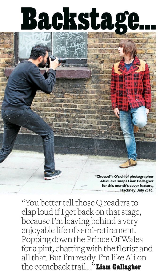 (右) “치이이즈!”: Q의 치프 포토그래퍼 알렉스 레이크Alex Lake가 이번 달 커버를 위해 리암 갤러거를 찍고 있다. Hackney에서, 2016년 7월.